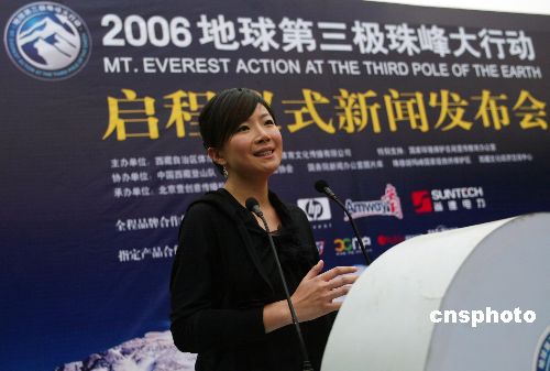 | 5月20日,2006地球第三極珠峰大行動啟程儀式新聞發布會在北京舉行,由社會環保志愿者、新聞媒體和企業代表組成的志愿者隊伍將于22日開赴西藏,展開為期16天的公益環保活動。活動的主旨是“實現人類與自然的和諧統一”,將組建第一支“珠峰環保登山隊”,完成地球海拔最高村落的亮電工程,對地球海拔最高的一所小學進行教育捐助并建立地球海拔最高的教育工作站,定期進行珠峰地區的環境宣傳教育工作。圖為志愿者代表著名歌手葉蓓在新聞發布會上講話。中新社發 杜洋 攝