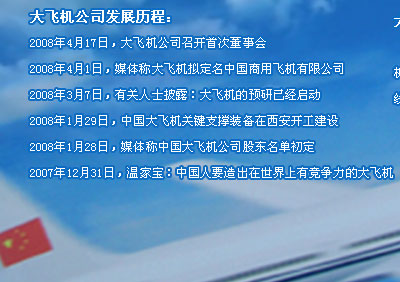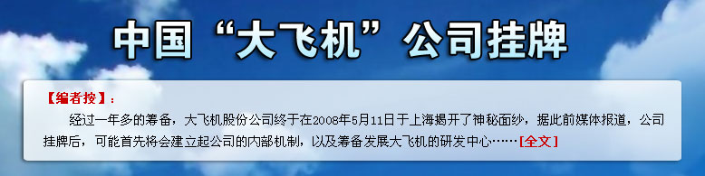 | 中共中央政治局常委、國務院總理溫家寶2007年12月29日到30日專程赴陜西西安。在西飛集團公司,溫家寶說,中國人要用自己的雙手和智慧制造出在世界上有競爭力的大飛機。他并鼓勵大家說,你們肩上擔子很重,要下決心把大飛機搞上去……<詳細> |