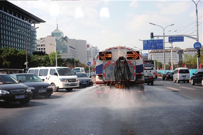 昨天下午3點,環衛工人采用灑水為西單地區地面降溫,記者從西城環衛中心了解到,往常西單中心區的日灑水量僅為20噸左右,由于遭遇連續高溫,近幾日增加作業次數,每天約灑水40噸左右。