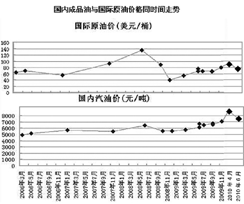 記者查資料發(fā)現(xiàn),2008年6月20日國(guó)際油價(jià)為每桶132美元,目前為80美元,與此同時(shí),我國(guó)的油價(jià)卻每噸上漲了1710元。