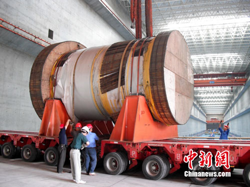 9日,由東方電機廠、哈海濱電機廠、天津阿爾斯通水電設備有限公司分別承建的3臺每臺重達百噸的三峽地下電站水輪發電機主軸,由有96個車輪的特種車輛運載,在三峽壩區交警全程護運下,從江北重件倉庫出發,橫跨西陵長江大橋,陸運12公里順利抵達三峽右岸電站廠房先期調試,確保穩定正常工作后,預計下月再轉移安裝到地下電站。