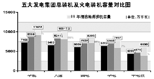五家發(fā)電集團的工作報告顯示,清潔能源發(fā)電比重自“十一五”以來得到了大幅增長。其中,中電投的清潔能源發(fā)電裝機容量占總裝機容量比重高達30%,拔得頭籌。根據2008年國家電監(jiān)會發(fā)布的《2007年電力企業(yè)節(jié)能減排情況通報》(以下簡稱《2007年通報》),中電投2007年裝機容量4300萬千瓦,其中火電裝機3327萬千瓦,占77.37%。根據2009年國家電監(jiān)會發(fā)布的《2008年電力企業(yè)節(jié)能減排情況通報》(以下簡稱《2008年通報》),這一比例并沒有發(fā)生太大變化。但2009年以來,中電投的清潔能源發(fā)電比重增加到了30%。拉西瓦水電站實現一年四投使中電投的水電裝機容量居五大發(fā)電集團之首。預計隨著海陽核電、紅沿河核電和彭澤核電等項目的推進,這一比重還會大幅提升。