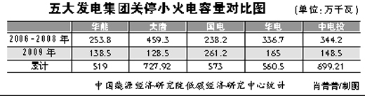 今年1月初,來自工業(yè)和信息化部的信息顯示,2009年全年關停小火電機組容量2617萬千瓦。去年電力行業(yè)的一件大事是“十一五”關停小火電的任務提前完成,小火電關停容量達到6006萬千瓦,30萬千瓦及以上火電機組占到了全部火電機組容量的64.46%。2007年,為實現“十一五”規(guī)劃綱要提出的單位國內生產總值能源消耗降低和主要污染物排放總量減少的目標,國家發(fā)改委頒布了《關于加快關停小火電機組的若干意見》的文件,對小火電關停做出了具體部署。本報對“十一五”以來華能、大唐、國電、華電和中電投等五大發(fā)電集團關停小火電的情況進行了統(tǒng)計,并對由此帶來的火電結構變化進行了調查,現將結果予以刊發(fā),以饗讀者。