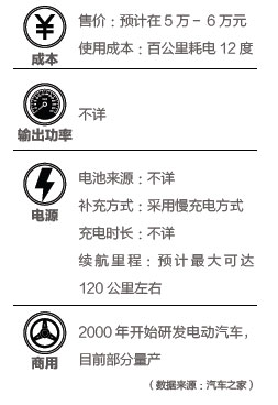 4月初,奇瑞汽車在其總部安徽蕪湖舉行了QQ3純電動汽車用戶交車儀式。奇瑞汽車總經理助理金弋波告訴《中國經濟 周刊》:“QQ3純電動轎車采用純電驅動,百公里耗電僅12度左右。目前該車已經順利通過國家安全碰撞測試,并已上榜工信部《節能與新能源汽車示范推廣工程推薦車型目錄》。”