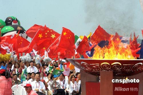 在奧運火炬青島傳遞終點青島第一海水浴場,圣火在青島民眾前熊熊燃燒。中新社發 廖攀 攝