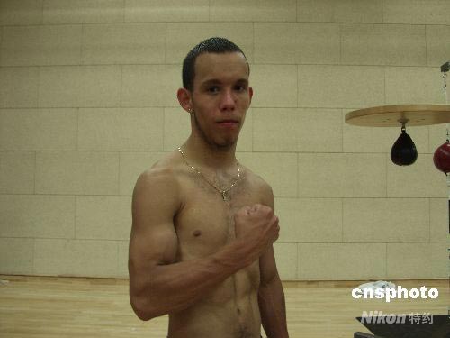 8月5日,美國拳擊隊在北京師范大學訓練營進行奧運會前的公開訓練。圖為奪金熱門拳手美國的路易斯·揚耐茲正展示自己的肌肉。他也是中國選手鄒市明奪金道路上最大的攔路虎。中新社發 賴松 攝