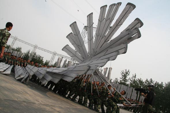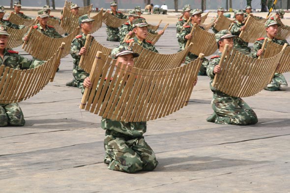 “我們前四個(gè)八拍動(dòng)作取名為“禮之用,和為貴”,一開(kāi)場(chǎng)就要把古代文人的氣質(zhì)淋漓盡致地刻畫(huà)出來(lái),要高傲,要自然,要放松,所有軍人姿態(tài)都要改過(guò)來(lái)……”第一天,導(dǎo)演們的一串“連環(huán)炮”就讓激情昂揚(yáng)的參演官兵傻了眼。
