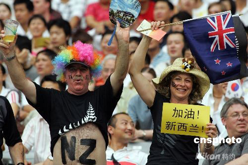 8月13日,北京奧運會男足小組賽,新西蘭VS比利時的比賽在上海體育場進行。熱情的新西蘭球迷打出中文標語為球隊加油,成為了場邊一道靚麗的風景。 中新社發 湯彥俊 攝
