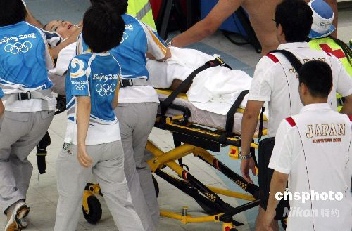 奧運會救護人員將日本隊昏厥運動員送往醫院。中新社發 任晨鳴 攝