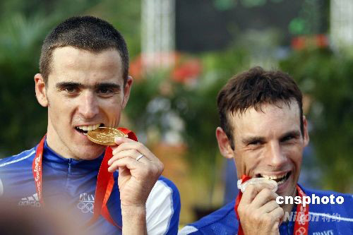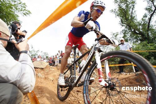 8月23日,在北京老山山地自行車場進行的男子自行車越野賽中,法國名將朱利安-阿布薩隆(左)以1小時55分59秒成功衛冕該項目的冠軍。法國另一位選手讓-克里斯托夫-佩羅(右)以1小時57分06秒的成績獲得銀牌。 中新社發 盛佳鵬 攝