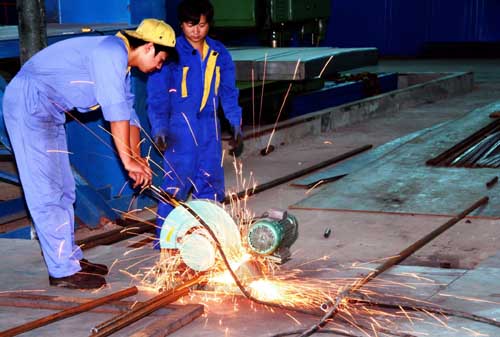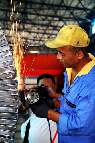 一名工人在師父的指導下切割鋼材。 中新社 馮昕 攝 一名工人在打磨設備。 中新社 馮昕 攝
