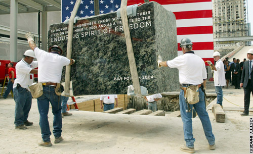 2004年7月4日:“自由之塔”的建設工作在美國獨立日當天開始。一塊重達20噸的花崗巖被作為地基放入施工現場。這塊花崗巖上銘刻了這樣的碑文:“為了紀念和銘記在2001年9月11日失去他們生命的遇難者,以及作為對永久的自由精神的貢獻。2004年7月4日!