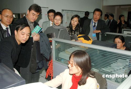 中國(guó)新聞圖片網(wǎng)絡(luò)中心主任劉莉生(前左一),向第二期海外華文媒體高級(jí)研修班學(xué)員介紹該中心的發(fā)稿情況。該中心由中新社主辦,是中國(guó)大陸目前僅有的兩家每天即時(shí)滾動(dòng)播發(fā)新聞圖片的機(jī)構(gòu)之一。