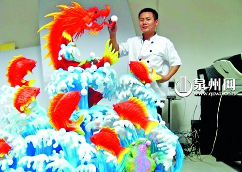 “飛天迎賓”、“鯉魚化龍”“東方醒獅”、“渡海觀音”等我(泉州)市各縣(市、區(qū))一些群眾熟悉的城市標志,它們多為石頭、瓷、銅器等硬物雕刻而成。然而,在石獅某酒店中,“80后”的食雕師朱愛明,則用各種食品或泡沫雕成這些標志,成為宴席上的亮點。