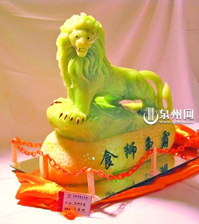 據(jù)朱愛明介紹,在作出雕刻城市標志決定后,他便找機會對每個市標進行實地觀察并拍照,然后取材。“因為造型、圖案等的不同,不同的市標必須用不同的食品來表現(xiàn)”,他說,比如石獅的市標,獅子頭尾高低位置相差較大,這就要求材質(zhì)必須是實心的,而且要雕出70cm高的作品,顯然很難從天然的瓜果蔬菜中找到,于是,他就選擇了石花膏。