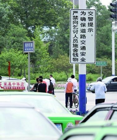 近來(lái),在省城石家莊“迎賓大道”裕華路與建設(shè)大街交叉口,交管部門豎起的兩塊“新式”交通警示牌引發(fā)市民議論!盀榇_保道路交通安全,嚴(yán)禁向乞討人員施舍錢物”的警示語(yǔ)赫然入目,對(duì)此,記者在采訪中也聽到了社會(huì)各界的一些不同看法。