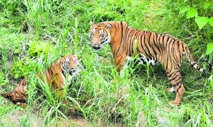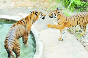 廣東省唯一的華南虎馴養繁殖基地——“粵北華南虎馴養繁殖研究中心”飼養的兩只國寶級成年華南虎“公主、王子”,自今年3月10日初婚洞房后,至今仍沒有懷孕跡象。昨天上午,在本報記者的見證下,研究中心決定實施第二階段的繁育試驗——讓公主與王子雙雙再入洞房,然后零距離長時間生活培養感情增加懷孕幾率。