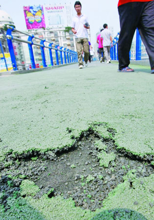 記者問:天橋剛修成僅一個多月,為何會出現大面積破損現象。張成立說,該路段交通異常擁堵,天橋工期趕得非常緊!坝捎谛腥艘^橋,影響了施工,所以上面本來要噴的一層固化膠就缺少了,以致地墊黏合性差,F在,我們要在上面再噴固化膠!