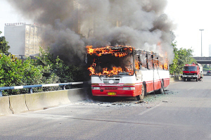 早8點35分,北京市東南三環華威橋南側一輛638路公交車發生自燃,司機在發現危險情況后立即將公交車停靠輔路安全地帶,疏散車內乘客,并報警,8時50分,公交車大火被消防員迅速撲滅。