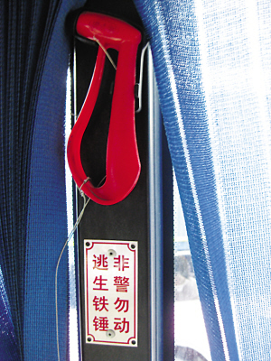 一輛車上,司機自帶一把安全錘,司機駕駛座位附近設有一把安全錘,每隔一個車窗也有一把安全錘。一般來說,南京每輛公交車上都有五把安全錘。