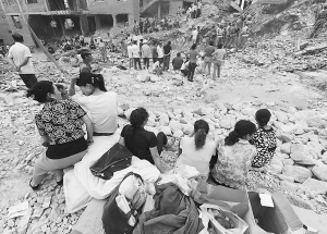 她家的樓房一大半被埋入黃土,露頭的斷壁殘?jiān)脖粵_得嚴(yán)重移位,往南挪了幾米。泥石流吞噬了她的老伴和小兒子。一整天,她都坐在一床舊棉被和一條舊毛毯上發(fā)呆,那是她救出的全部家當(dāng)。唯獨(dú)陌生人楊金鳳獲救的那一刻,老人才忘情地拍手叫好。