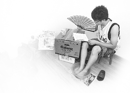 小韓說,自己與同學發明了一套“泡腳”消暑法,每當晚上酷熱難當時,便每人接上滿滿一桶涼水,把雙腿完全泡在其中,泡腳的同時還可以看書、上網,感覺非常涼爽。