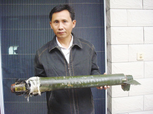 昨天一大早,記者來到朱賢文家,那是一幢很漂亮氣派的別墅式的小三樓建筑,樓下還開有一家小店。小朱正在院子里盤弄著一個類似火箭彈一樣的綠色物體,在他腳下的一只破臉盆里,凌亂的放著些黑色部件。小朱說,這些零部件都是彈體上掉下來的,他也不知道是些什么玩意。附近多名村民也圍聚在小朱家中,一邊看稀奇一邊熱議這到底是個什么東西,同時探討小朱該到何處去尋求賠償。