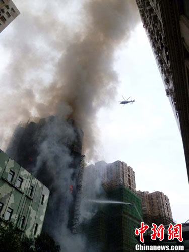 在火災現場,記者看到,起火高樓外表已被燒黑,現場火勢洶洶,濃煙滾滾;附近道路地面上覆蓋了大量灰燼,水流滿地;周邊方圓數百米內充滿了煙霧和刺鼻的氣味;來自交警方面的信息稱,失火大樓周圍數條道路已被封鎖。記者看到,不僅消防車緊急出動,警用直升飛機也參與高樓救援。