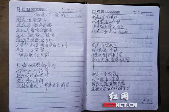 寫這首歌是去年9月,當時他正在杭州打工,晚上躺在集體宿舍用手機聽電臺,“忽然聽到‘農民工’三個字,我靈感就來了,我們這一屋子全是農民工啊。”趴在床上,蔡宗廈用鉛筆在日記本上認真地寫下了歌詞。