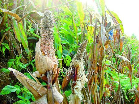 昨日,記者隨村民走進被“摧毀”的玉米地里,只見大片大片的玉米地里一片狼藉,被鸚鵡的“尖牙利齒”啄食過的玉米包,只剩玉米棒子孤零零地豎在玉米稈上,很多玉米心里都被啄食殆盡或零星還粘著幾粒。沒有啄盡的,也因為玉米包衣被啄爛而長出芽或發霉變黑。