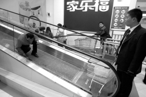 昨天中午1點多,記者在家樂福立水橋店看到,3層到2層的下樓電梯已停運。在電梯下口處,最底端的兩塊兩米長玻璃擋板已完全破碎,電梯縫中仍卡著大量玻璃碎片,保潔人員正在清理。