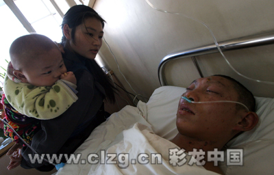 在燒傷科,尹家敏和他另外兩名受傷工友躺在同一間病房,焦急的家屬守候在床邊。其中一名工人茍子明今年才22歲,他的兒子剛滿9個月。