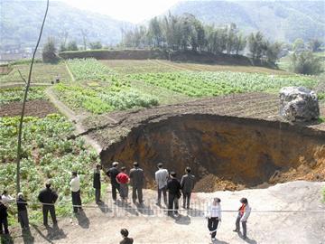 2008年3月25日凌晨,宜賓江安縣紅橋鎮(zhèn)五閣村發(fā)生了局部地面塌陷,形成大小不等的3個(gè)巨型“天坑”,呈直線展開,長約400米。塌陷嚴(yán)重威脅到附近的11家住戶57人。險(xiǎn)情發(fā)生后,江安縣委、縣政府及當(dāng)?shù)丶t橋鎮(zhèn)政府立即緊急疏散塌陷影響區(qū)域內(nèi)的居民,并對(duì)“天坑”實(shí)施24小時(shí)的臨時(shí)警戒,防止意外事故發(fā)生。截至昨日,國土資源部門的地質(zhì)專家現(xiàn)場查勘得出的初步結(jié)論是:該地面塌陷是因?yàn)榈叵氯芏匆l(fā)的小型巖溶塌陷,是自然形成的地質(zhì)災(zāi)害;進(jìn)一步的結(jié)論及處置措施待觀察3—5天后再定。