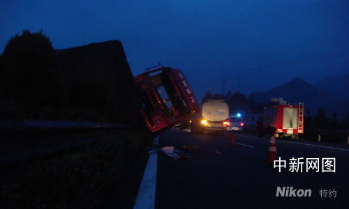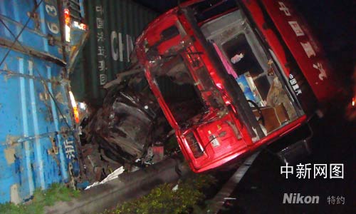 據了解,第一次追尾的兩輛集裝廂卡車已經被分離開,工作人員正在拖離事故車輛。在后方不到兩公里處被堵車輛長隊當中,一輛大型集裝廂卡車(為浙BA9429)的車頭已經完全搭在了中間的隔離帶上,駕駛室已經竄到了旁邊的另一方向車道上。前面是一輛中型廂式貨車(浙JA6312),已經被大卡車撞翻,橫在路中央,在兩輛車右側和前側,先后有四輛車都發生追尾和刮擦,受傷的(浙JA6312)司機已經被救出送往醫院。