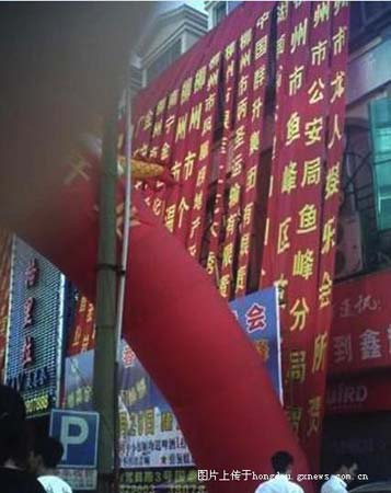 8月28日,位于柳州市文惠橋南頭的一家夜總會開業(yè)。三天后,網(wǎng)友“fox_nn:”在紅豆社區(qū)柳州論壇上發(fā)帖并配上圖片。圖片上夜總會開業(yè)的祝賀條幅,幾乎把整個樓房都蓋住了,其中最引注目的,是標(biāo)注柳州市魚峰區(qū)政府及柳州市魚峰區(qū)公安分局祝賀的條幅。