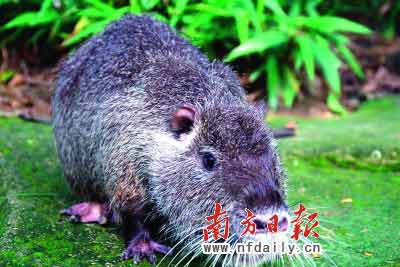 昨日,記者在常平鎮隱賢山莊的動物園里看到了這只碩鼠,它身長過尺,渾身橫肉,整個身子圓滾滾的,像一只小牛犢;灰黑色的毛又長又亮,如小鋼絲般粗;四條腿粗壯而結實,腳趾帶有尖利的趾甲,長長的尾巴比大人的拇指還粗。一看到有人靠近,它立即豎起耳朵、直起身子、瞪圓眼睛,一副隨時進攻的樣子。