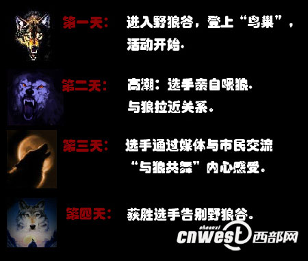 據西安秦嶺野生動物園負責人任飛翔介紹,該園將在陜西省內招募三名年齡在二十二歲至四十五歲之間,寫作能力強,善于使用照相機、攝像機,膽量過人且有一定戶外生存經驗的男士,于十二月八日進入野狼谷指定活動區域——酷似“鳥巢”的茅草棚居住三天。 期間吃、喝、拉、撒、睡均在“鳥巢”里度過。要求他們記錄下野狼的活動規律、生活習性、等級序列、幫派體系,以及狼與狼之間的情愛恩怨,狼與人之間的關系和挑戰者的感受。按要求完成挑戰任務者,將獲得五千元人民幣獎金,并頒發榮譽證書。