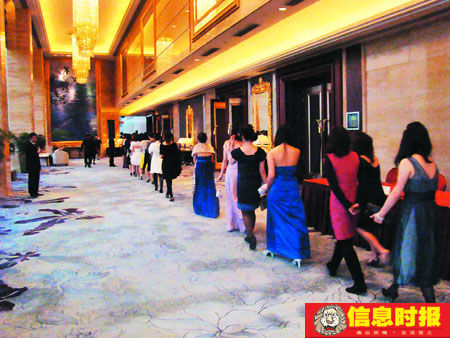 1月10日晚,備受關注的廣州史上最昂貴的“世紀佳緣.名仕之約”相親會,終于揭開了神秘的面紗,在廣州一家五星大酒店里,從6000多名報名者中脫穎而出的40名美女,嚴冬之下穿著單薄、靚麗的晚禮服,邁著貓步,擺出媚態,供30名鉆石王老五們鑒賞。[1月11日[[信息時報]]]