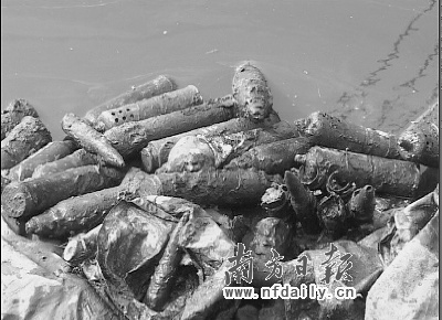 昨日上午,在廣州白云區(qū)石井河涌邊,打撈垃圾的環(huán)衛(wèi)工人在泥堆中發(fā)現(xiàn)許多炮彈(見(jiàn)上圖,市民提供)。目前,警方已將附近封鎖,等待退潮后打撈處理。