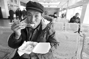 昨天11:00,記者來到中央門汽車站,站前廣場(chǎng)上空無一人。前天還像煮餃子一樣的候車大廳,只有稀稀拉拉的幾十個(gè)人。下午3:20左右,車站端出了為旅客精心準(zhǔn)備的“年夜飯”:一鍋餃子,共40碗分盛給站內(nèi)的每一位旅客。一位前往南通的老漢邊吃邊笑呵呵地說:“好吃,真好吃。”15:40,隨著南京到南通的最后一班車徐徐駛出,車站歸于了平靜。年前的春運(yùn)就這樣順利落幕了,沒有一名旅客滯留在車站。車站人士介紹,昨天一天的客流量約在5000人次,僅是24日的1/12。