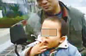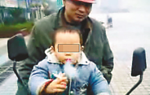 這段長達(dá)四分半鐘的視頻是一名網(wǎng)友十天前發(fā)布的,聲稱是在萬州周家壩現(xiàn)實(shí)攝錄,視頻上面一名兩三歲的小男孩坐在一輛大人的摩托車前部,在一群成年人一陣“燒起”的起哄聲中,開始表演點(diǎn)火抽煙。