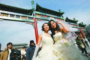 情人節(jié)的中午,兩對盛裝的同性戀情侶在前門步行街拍攝婚紗照,并和其他同性戀朋友一起向路人贈送玫瑰。參與的同性戀情侶稱,希望通過公開拍攝同性結婚照的形式,推動社會對同性戀群體的關注和接納。