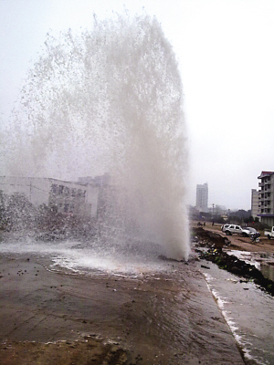 “先是聽到吱吱吱地響,馬上要到10點時,突然‘砰’的一聲后,一股水柱就沖上天了!60多歲的黃婆婆當時在現場,據她介紹,沖天水柱有人的大腿粗細,“起碼有十多米高。”