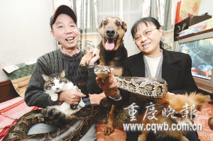 王啟懷老兩口沒(méi)有和孩子們住在一起。據(jù)了解,除了緬甸蟒外,老兩口還養(yǎng)了鷹、猴、八哥甚至青蛙等寵物,雖然寵物們每個(gè)月的直接伙食費(fèi)都在300元以上,但他們卻其樂(lè)無(wú)窮,“你對(duì)它好,它就對(duì)你好。你沒(méi)有理由不善待它們。”(本欄稿件由 首席記者 黃艷春 實(shí)習(xí)生 楊雪婷 采寫(xiě))