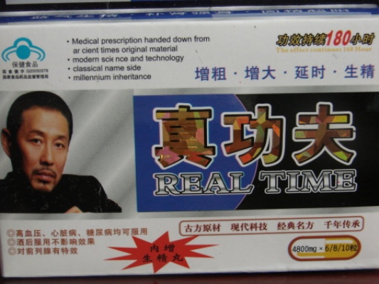 這個(gè)被網(wǎng)友戲稱為2009年度最牛的假廣告的壯陽藥品名叫“真功夫”。盒子左側(cè)赫然印著陳道明的大頭像。盒身背后標(biāo)明的生產(chǎn)廠家是香港威龍科技有限公司,地址為香港告士打路科技大廈B座2806。而據(jù)一些熟悉香港的網(wǎng)友稱,這個(gè)地址根本是子虛烏有。而其批準(zhǔn)文號是冒用江蘇一家企業(yè)的。最雷人的是,這款擺明是假藥的壯陽藥上還寫著“功效持續(xù)180小時(shí)”——網(wǎng)友笑言這款藥品持續(xù)時(shí)間竟然超過了中國最牛的手機(jī)超長待機(jī)電池。
