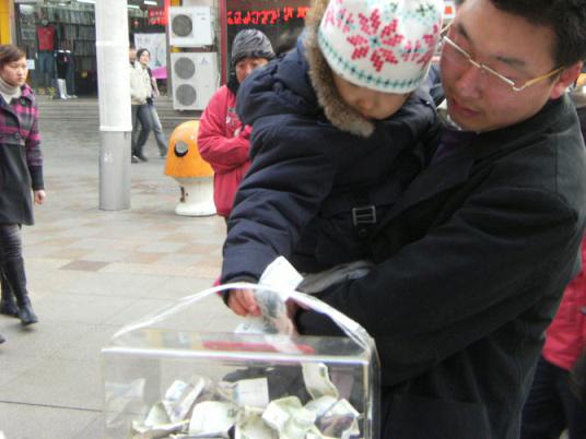 “我和我的好姐妹王靜一起,在青島市區準備組織這次捐款活動。”劉冰心說,“開始的時候由于城管管理的比較嚴格,所以只能通過市北區紅十字會協調,最后允許我們的捐款活動可以組織兩天。”