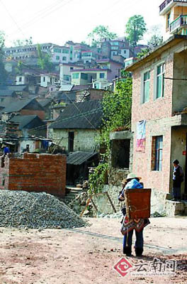 不過,如今的年輕人們再也不愿意住蘑菇房了,他們也希望住上他們見過的像城里人一樣的樓房,可是在大山里蓋樓房得花比外面更多的錢,因?yàn)榇u要從建水買了拉來,2角多一塊的磚拉到這里,已經(jīng)快達(dá)到5角錢了,還有鋼筋、水泥等,汽車?yán)瓉砗笤俦车郊,要的錢就更多了,因此,李萬勇家4年前蓋的樓房只蓋了底層。今年,李萬勇家要蓋第二層了,他的活計(jì)是拌砂灰,請來的兩個(gè)師傅砌墻,而爹媽的任務(wù)就是用背簍將磚一塊塊地背上來。