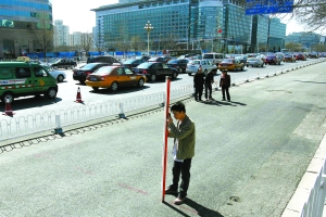 昨日12時許,西單文化廣場前的長安街非機動車道兩頭出入口,已經(jīng)被拉上警戒線,交警及協(xié)管員指揮過往非機動車,由廣場人行道繞行。警戒線內(nèi),非機動車道上一面積近40平方米的路面輕微凹陷,形成一個明顯但弧度不大的低洼處。柏油路面上,工作人員用噴漆標(biāo)記了沉降范圍,以及需要進行勘測的監(jiān)測點。