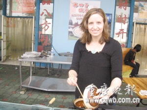 “我先來,是這里的地主!避噭P茜說,開餃子店幾年來,她學會了怎樣與菜市場的小商小販討價還價,學會了怎樣招徠顧客。其他老外初入洋人街開店,她主動幫忙,給他們當翻譯等。為給新來的老外“扎場子”,她還經常組織朋友去照顧生意。