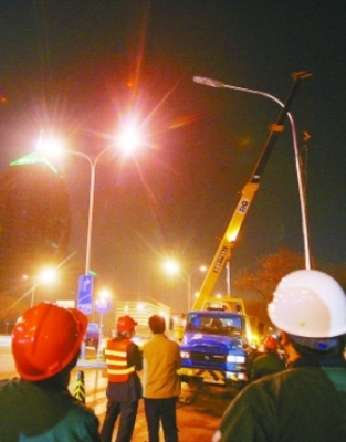 昨晚11時40分,北京長安街東單北大街至建國門路段上,嶄新的13米單弧鐵桿路燈拔地而起,宣告長安街路燈改造工程全面啟動。